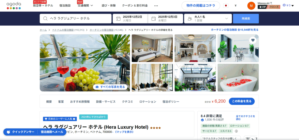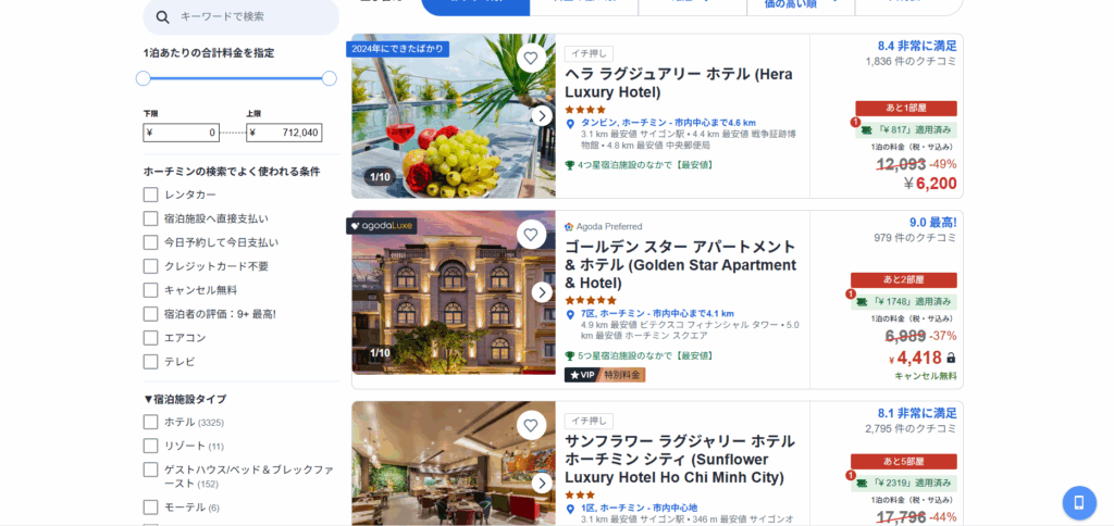 ただし、表示価格の仕組みには注意が必要です。検索一覧画面では税金やサービス料が含まれていない価格が表示され、決済直前の画面でそれらが加算されて金額が上がることがあります(設定で総額表示に変更も可能)。また、最安値プランは「キャンセル不可」であることが多いため、日程が完全に確定している人向けと言えます。 とは言え、ベトナムの格安ホテルを探す上での第一候補であることは間違いなく、まずはAgodaで相場を確認するのが賢いやり方です。